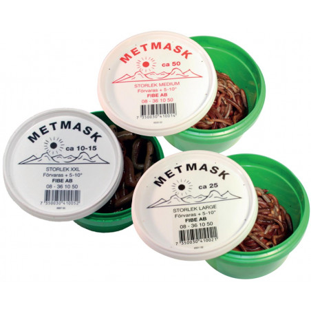 Levende mark/makk som agn til ørret- eller laksefiske. Stor størrelse. Ca. 25 stk. i hver boks.