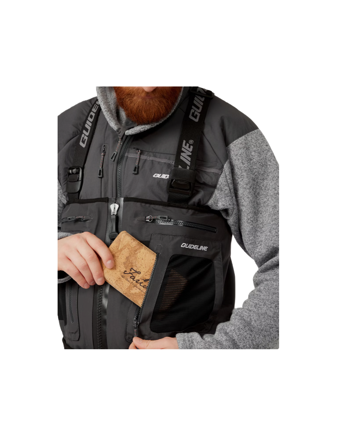 Den vanntette glidelåsen i front er levert av det tyske firmaet TIZIP. Disse har overlegen fleksibilitet og styrke. To vertikale lommer i front svelger med letthet store fluebokser. Lommene er ikke vanntette, så ikke oppbevar elektroniske gjenstander eller annet som ikke tåler vann.